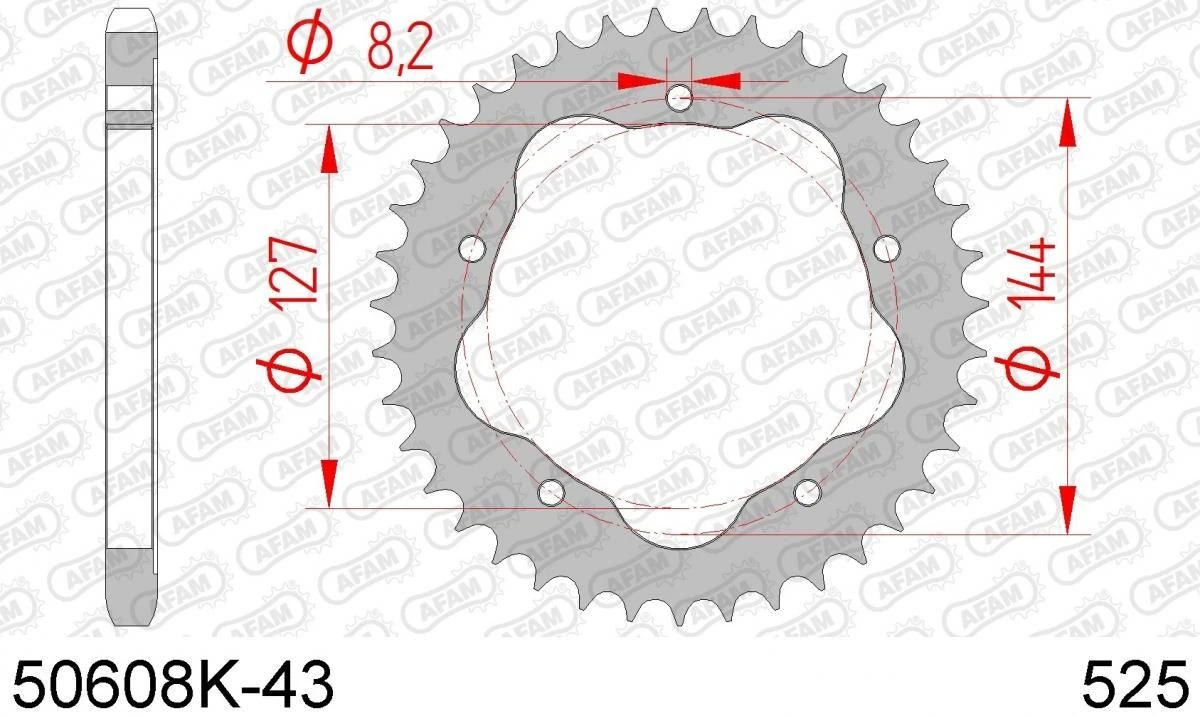 Een stalen 43 tands AFAM achtertandwiel. De tandwielen van AFAM zijn gemaakt van C45 staal met inductie geharde tanden, het tandprofiel is concentrisch, plat en perfect rond. Door deze samenstelling zijn de AFAM tandwielen perfect ter vervanging of zelfs ter verbetering van de OEM tandwielen.